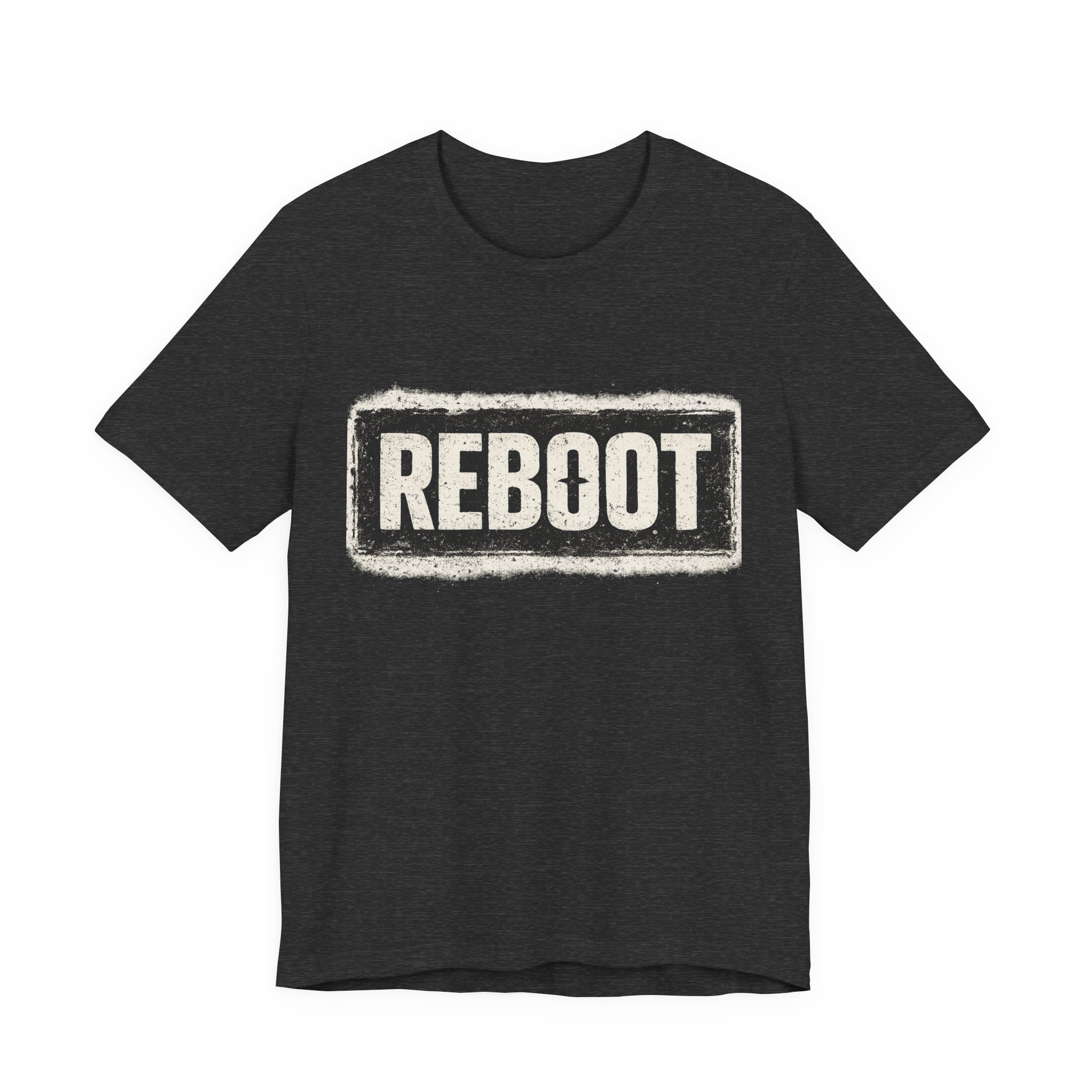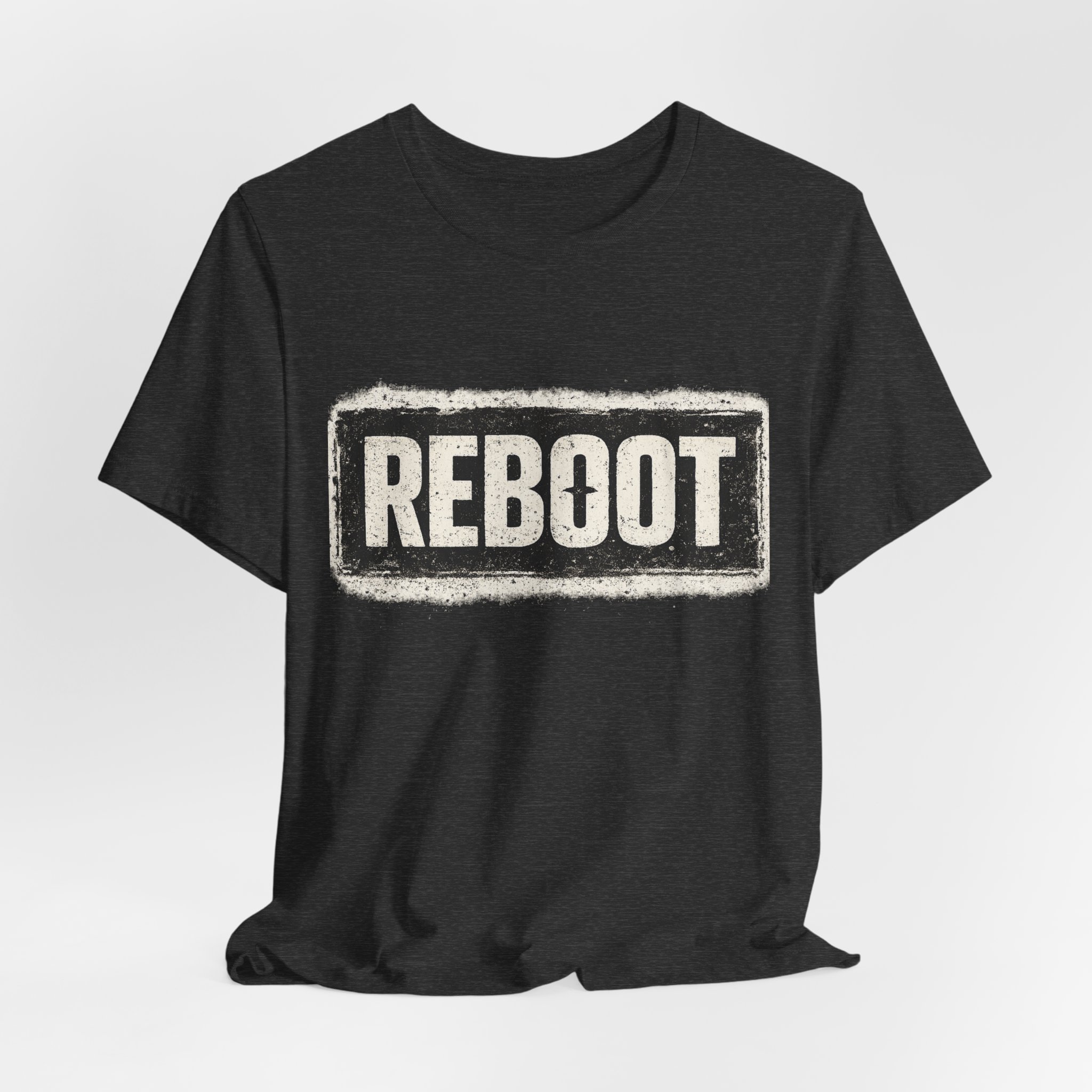 REBOOT — Minimalist Typo Tee: A tight 1-word typographic punch for fans who like quiet tech humor. The exact word REBOOT appears in heavy condensed sans with slightly rounded corners and a hand-distressed texture—tiny flecks and uneven ink coverage give it an indie-printed stamp feel. Centered and bold, this shirt reads well at streams and IRL while remaining clean for layered streetwear. Subtle coded nod: the letter O has a three-pixel notch as an Easter marker for collectors. Short, meme-adjacent, and wearable across many fits.